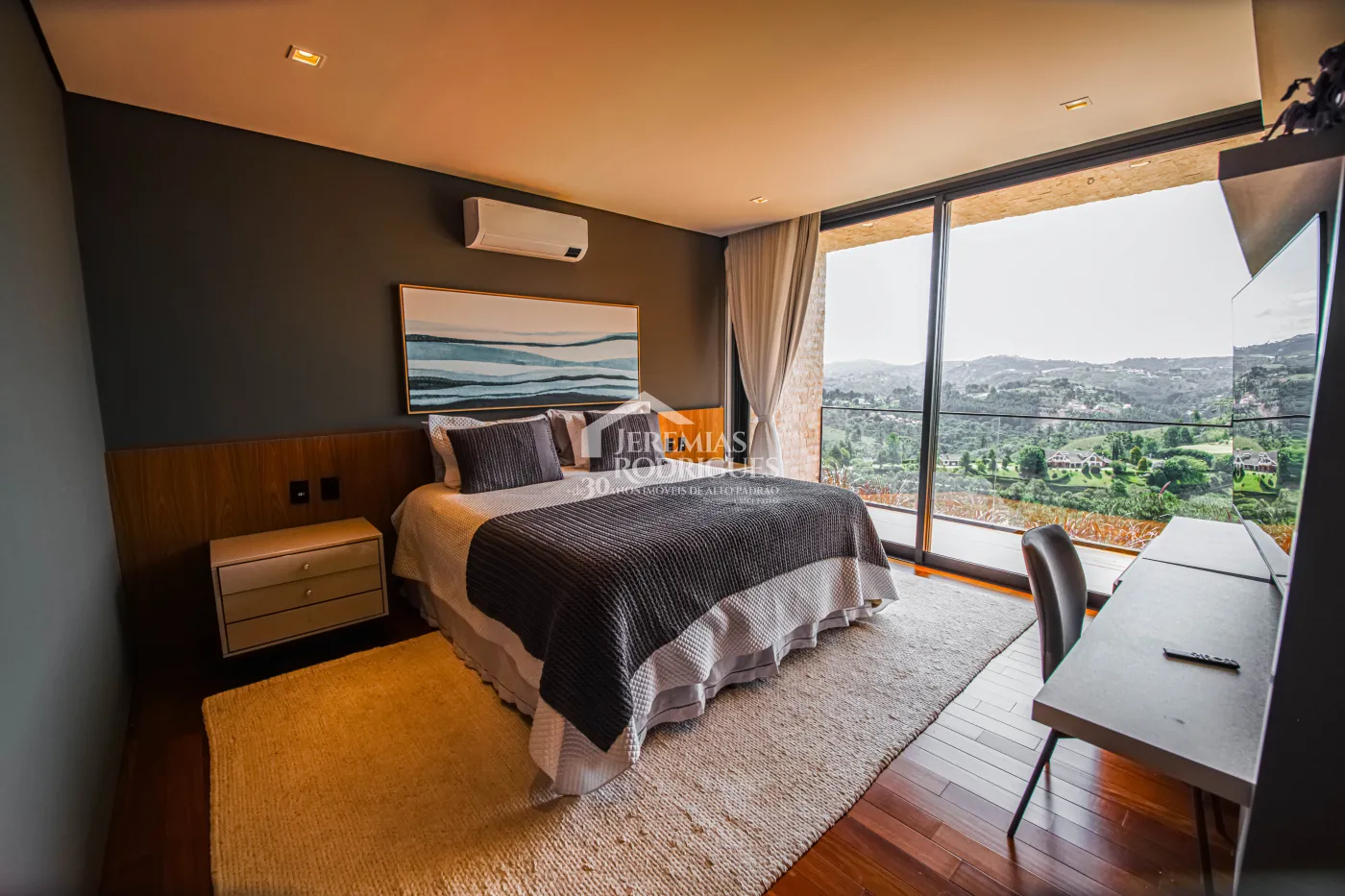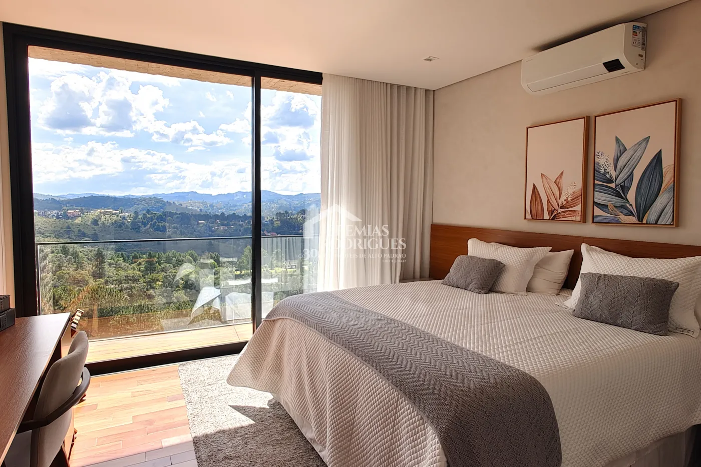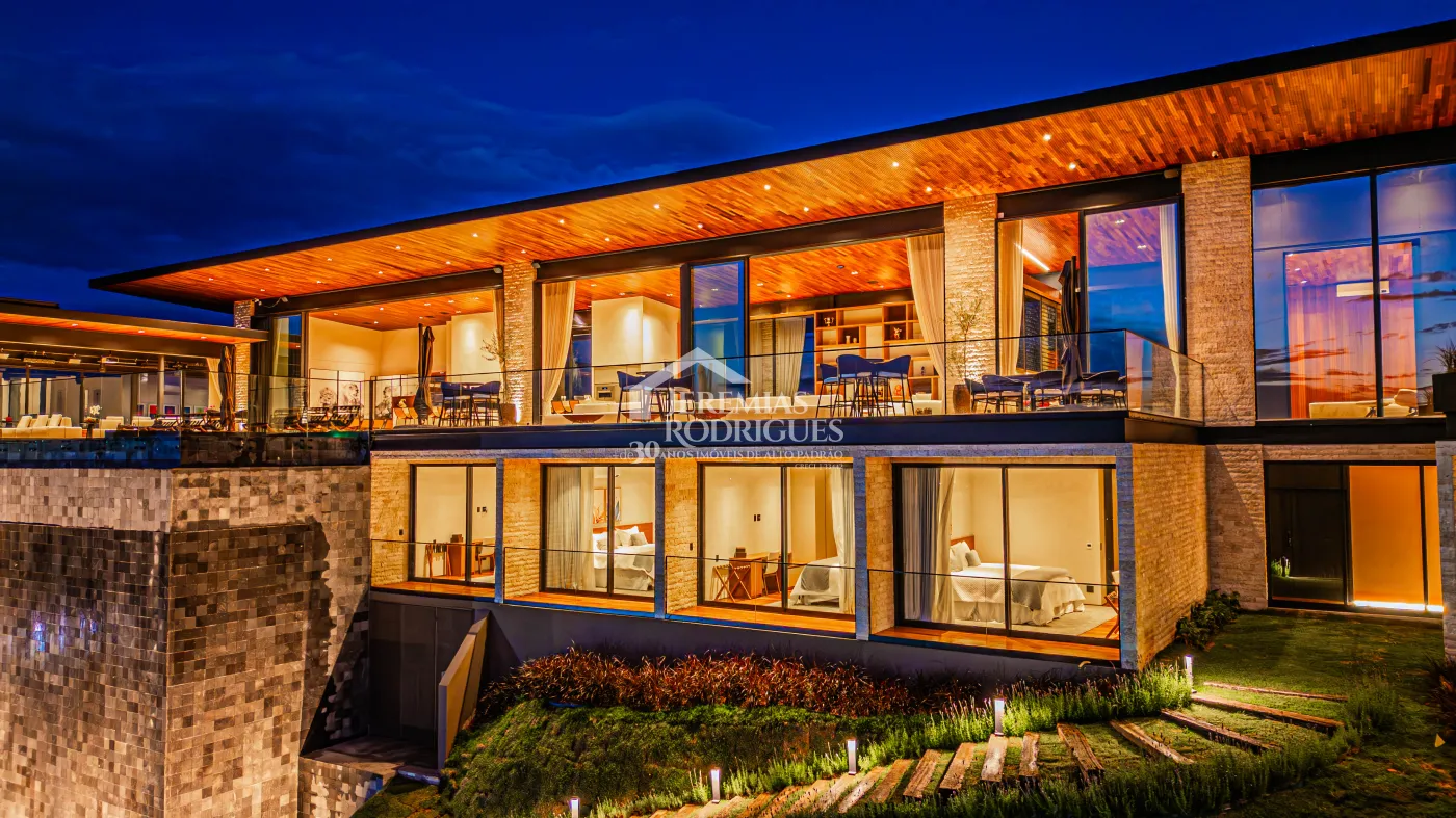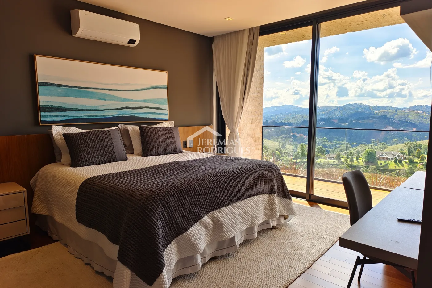 - 04 Suítes, sendo uma Master com telão e vista para a pedra do baú e cama explica e UNICA dos Irmãos Campana, mais 03 suítes sendo uma utilizada atualmente como escritório. Todas as suítes contam com banheiros equipados que aquecimento de piso, aquecedores de toalhas, mobiliários Vallve, e metais Hansgrohe. Os quartos possuem cama super king com pilou top em pluma de ganso e toda rouparia Trousseau personalizada, contam também com sistema de som e vídeo, aquecimento no piso e armários Kitchens.