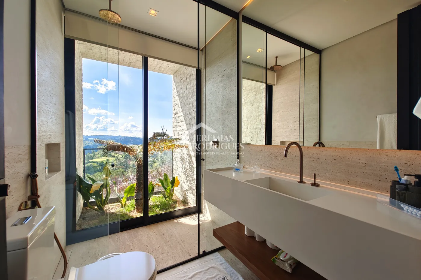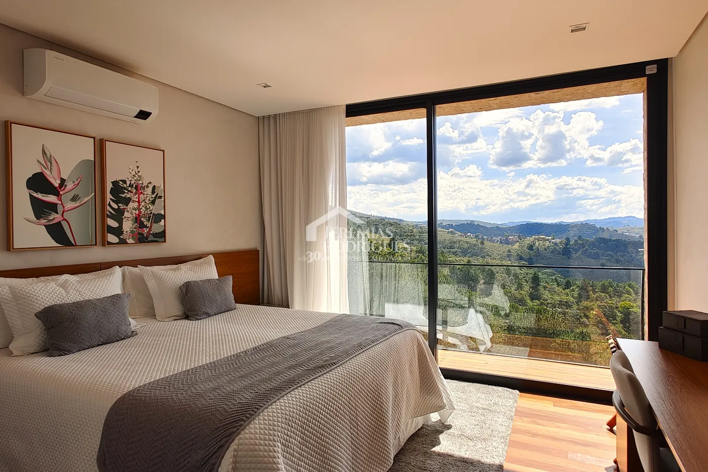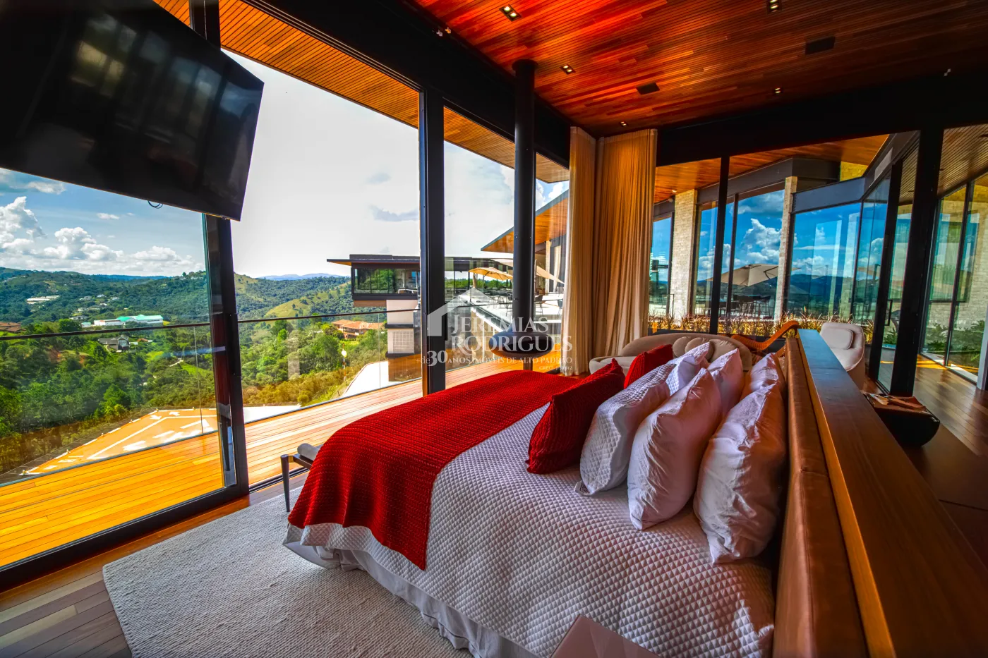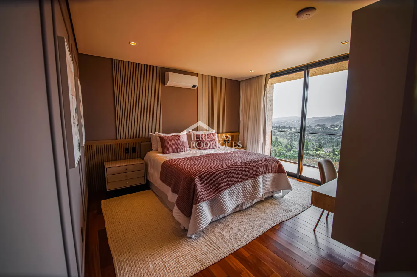 - 04 Suítes, sendo uma Master com telão e vista para a pedra do baú e cama explica e UNICA dos Irmãos Campana, mais 03 suítes sendo uma utilizada atualmente como escritório. Todas as suítes contam com banheiros equipados que aquecimento de piso, aquecedores de toalhas, mobiliários Vallve, e metais Hansgrohe. Os quartos possuem cama super king com pilou top em pluma de ganso e toda rouparia Trousseau personalizada, contam também com sistema de som e vídeo, aquecimento no piso e armários Kitchens.
