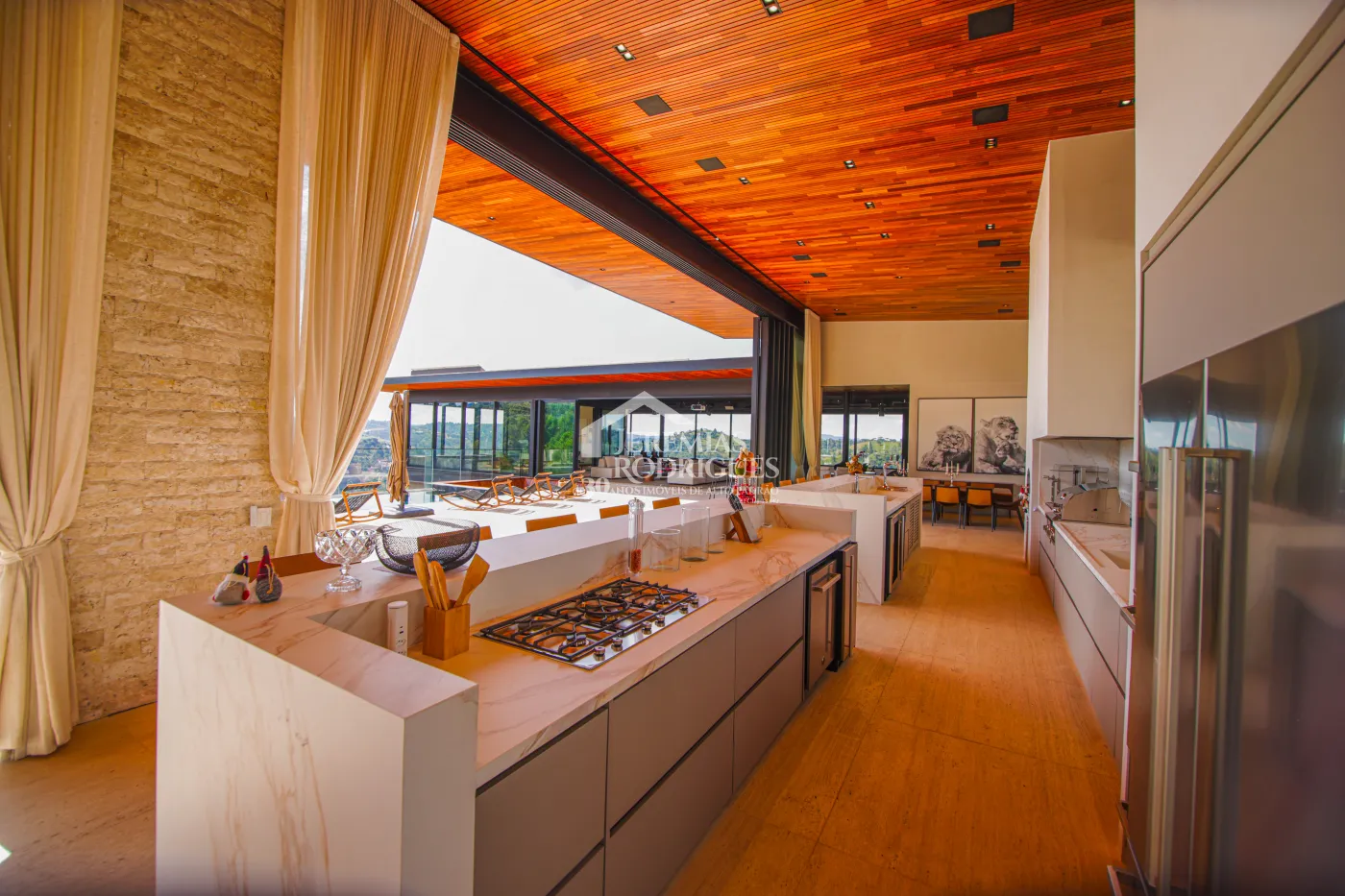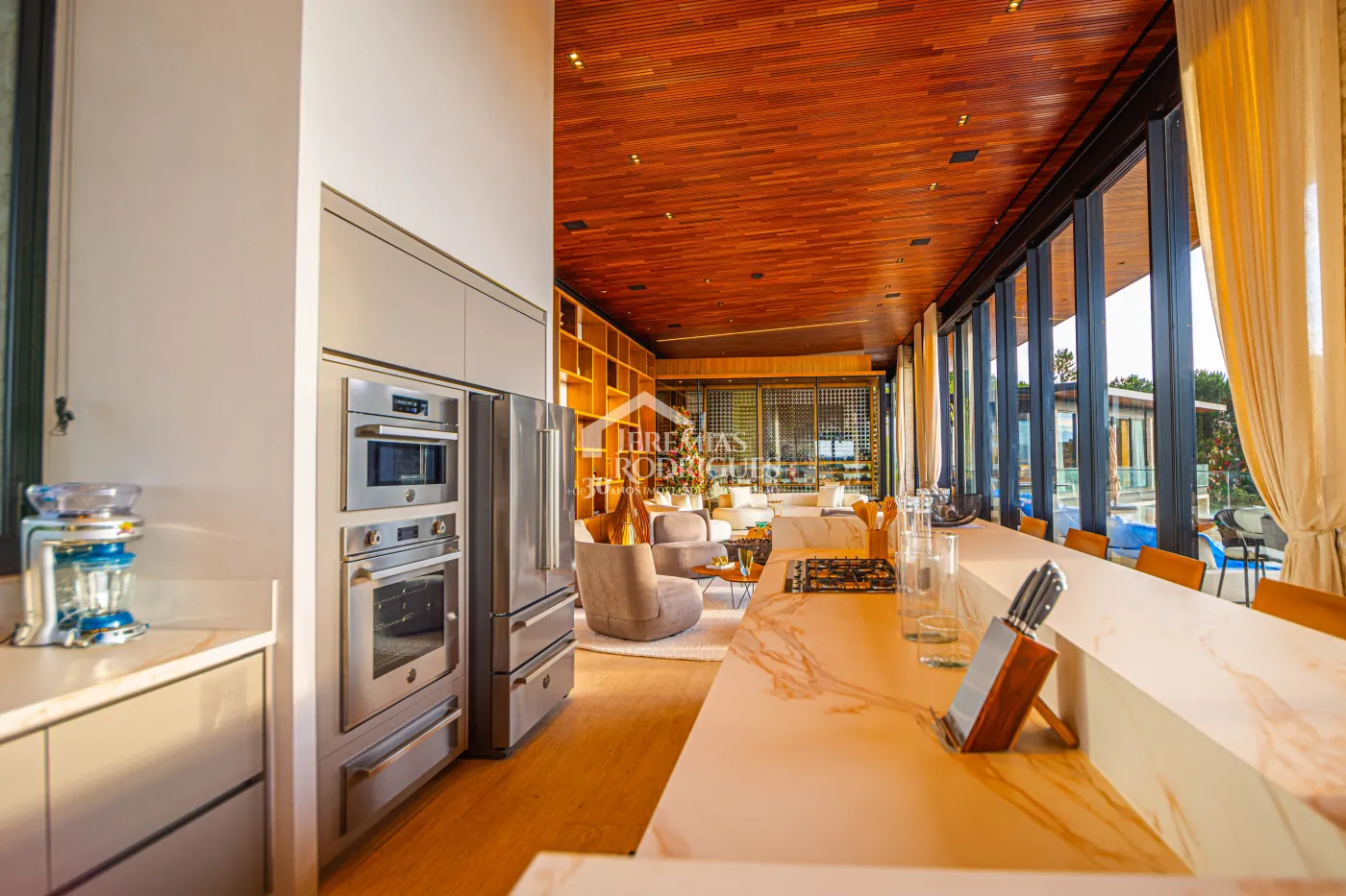 Cozinha Americana com armários Poliform e equipamentos alemães Gaggenau, mesa em madeira e mármore para 8 lugares e Lustre Taraxacum da Italiana Flos.